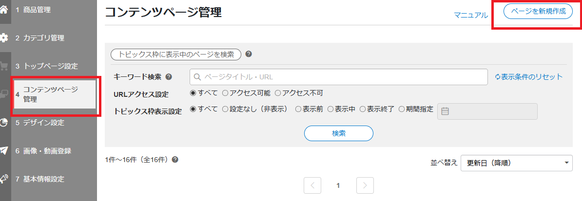 | ・ページタイトル ・URLの末尾(パーマリンク) ・トピックス枠への表示有無 ・公開/非公開の状態 ・サムネイル |
