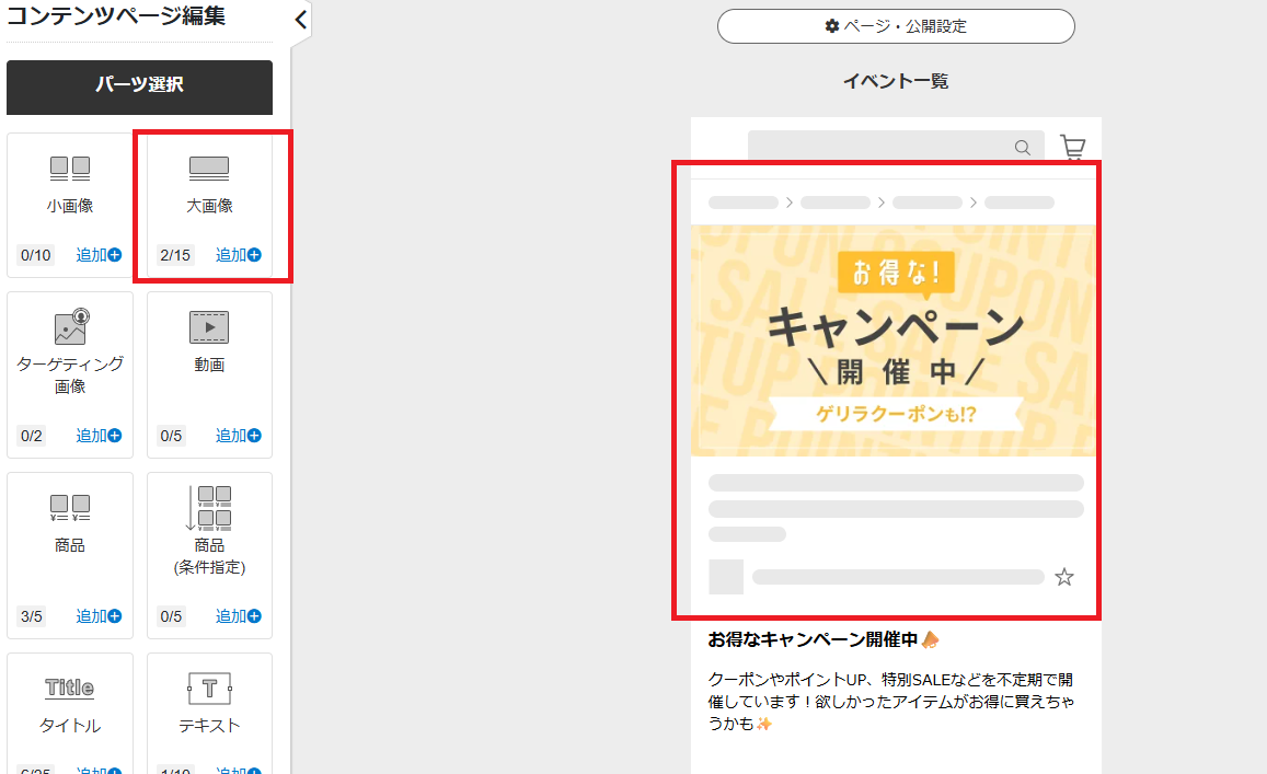 | ・テキスト:見出し・説明文 ・画像:バナーやイメージ写真 ・商品パーツ:商品管理番号や条件指定で検索・選択 |