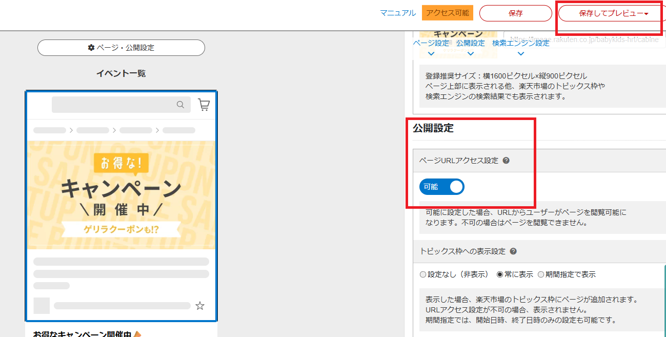 PC・スマホそれぞれの画面で問題がなければ、ページ設定で「URLアクセス可能」をオンに切り替えて公開状態にしましょう。