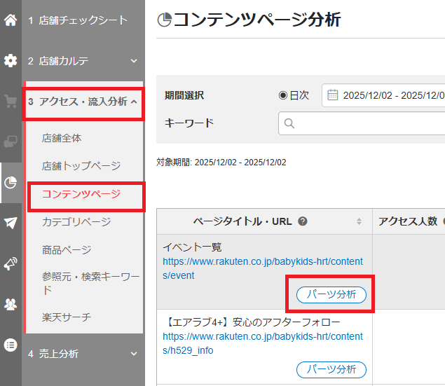 RMSトップ>データ分析>3.アクセス・流入分析>コンテンツページ>パーツ分析