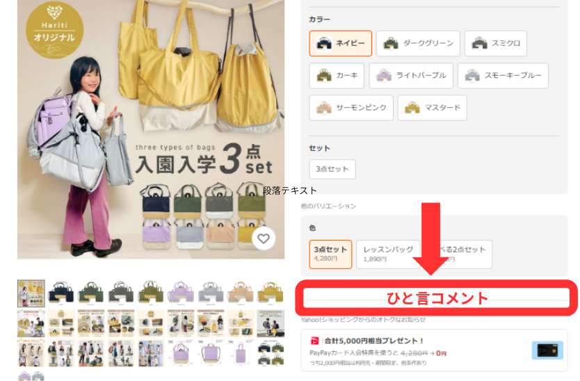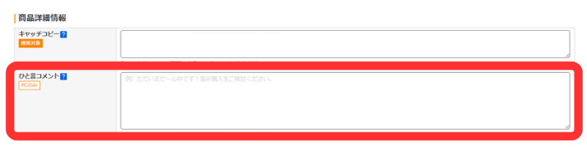 PC版商品ページでは、商品バリエーションの下に「ひと言コメント」を表示できます(画像の赤枠部分)。