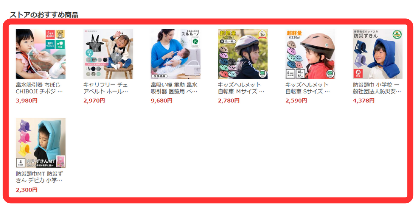 ここに売れ筋商品やレビュー評価の高い商品、特に訴求したい主力商品などを並べておくと、ユーザーは次に見る商品を迷わず選びやすくなります。