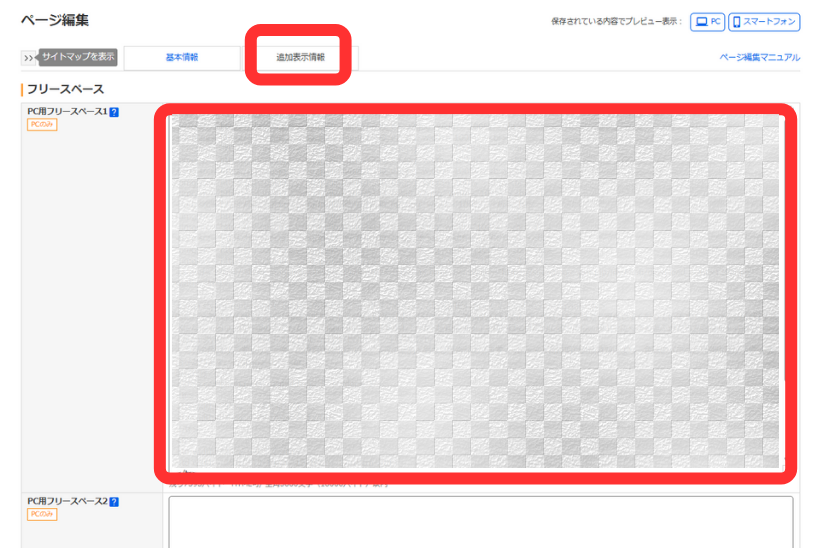 フリースペースの設定は、ストアクリエイターProの商品登録から商品管理を開き、編集したい商品を選択したうえで「追加表示情報」タブから行えます。